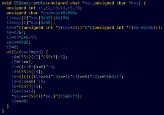 Создатели DeCSS пошли путём обратной разработки плеера Xing для получения ключа дешифрирования и алгоритма работы, что было признано незаконным[5].