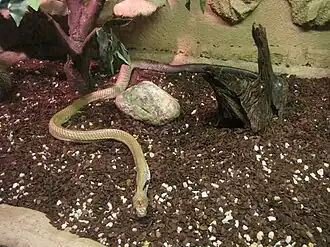 Крупная змея, длина тела которой может достигать от 1,8 до 2,4 м. Тело оливково-коричневой окраски с чёрным хвостом. Брюхо оливково-жёлтое. Имеет тёмные отметины вокруг глаз и вертикальную тёмную полосу за челюстью.