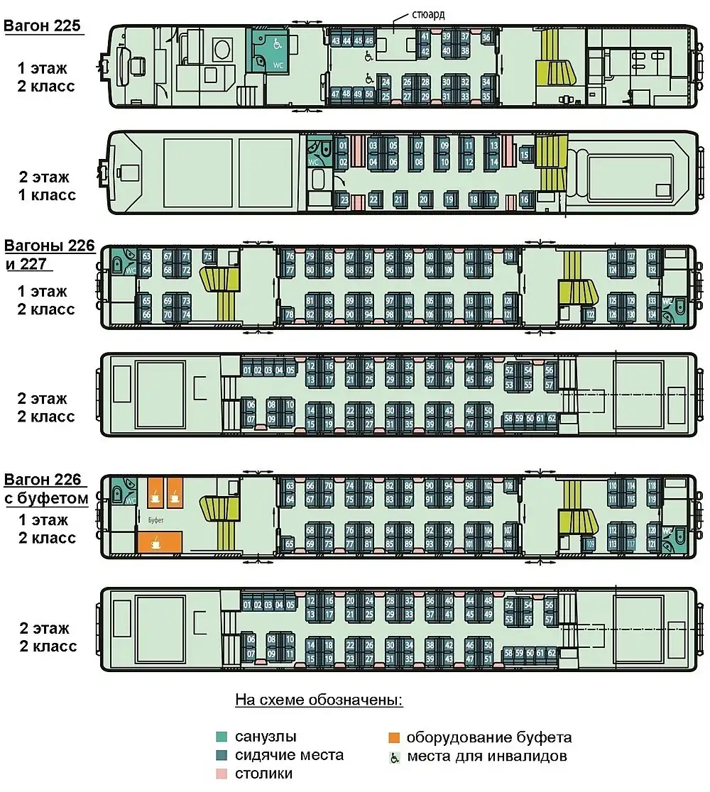 - количество мест — 623 (46 мест 1 класса и 577 мест 2 класса)[2][15];