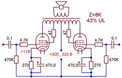 Оптимальная величина сопротивлений между сетками и общим проводом — 470 кОм, разделительных конденсаторов на входе усилителя — 0,1 мкФ (частота среза входного ФНЧ 3 Гц)[46]. Традиционная величина антизвонных резисторов в цепях управляющих сеток — 4,7 кОм; необходимость в этих резисторах определяется монтажом усилителя[46]. В типовых конструкциях Mullard и GEC антизвонные резисторы величиной 47 Ом включались и в цепи экранирующих сеток. Вероятно, помимо основной функции эти резисторы также снижают нелинейные искажения ценой незначительного снижения выходной мощности[46]. Во многих серийных устройствах (усилители Leak[46], радиолы «Симфония»[48]) эти резисторы отсутствовали[46].