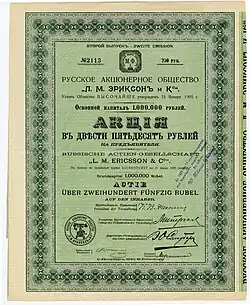 В 1881 году 15 ноября Ларсу Магнусу Эрикссону поступил заказ из Петербурга от Людвига Нобеля на изготовление партии телефонов и коммутатора для офисов петербургской компании «Товарищества нефтяного производства братьев Нобель». Первая телефонная станция Ericsson в России была построена в Киеве в 1893 году. Позже были построены телефонные станции в Харькове (1896), Ростове (1897), Риге, Казани и Тифлисе (1900) и Москве (1904)[19].