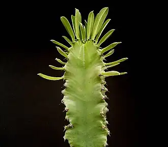 Ветви с 5 рёбрами, расположены канделябровидно, 3,5—7,5 см толщиной. Побеги членистые, тёмно-зелёные.