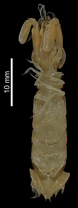 Корнеа (роговица) с двумя или шестью рядами гексагональных среднеполосных омматидиев. Максиллипеды MXP3—4 с яйцевидными проподиями, не ребристые вентрально. Тело сплющенное, слабо сочлененное или компактное. Рапторный коготь с терминальным ишиомеральным сочленением; дактилус с 4 или более зубцами, базально не вздутый; проподус с 3 проксимальными подвижными шипами. Тельсон с отчетливым срединным килем; субмедиальные зубцы с подвижными вершинами; максимум с 2 интермедиалными зубцами, крайние выходят вентрально. Уроподальный протопод с двумя первичными шипами; сочленение сегментов экзопода терминальное[1].