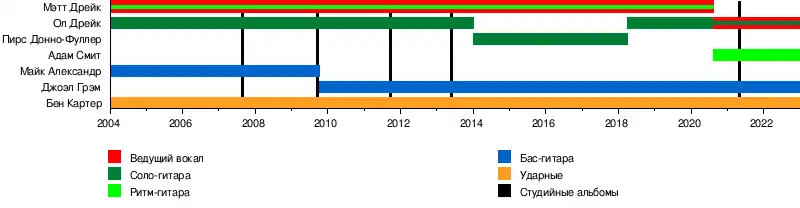 - Ол Дрейк — соло- и ритм-гитара, бэк-вокал (2004–2013, 2018–наст. время), ведущий вокал (2020–наст. время)