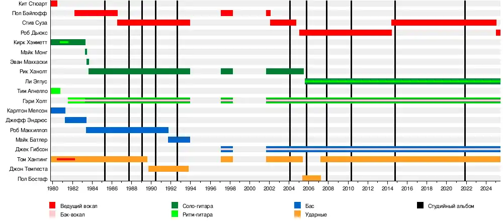 - Стив Суза — ведущий вокал (1986—1993, 2002—2004, 2014—2025)