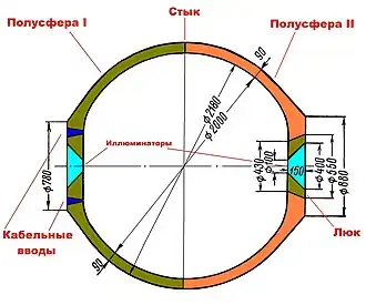 В гондолу ведёт запирающийся на болты люк в форме усечённого конуса, наружный диаметр 550 мм, внутренний диаметр 430 мм, толщина 150 мм. В люк встроен иллюминатор, через него экипаж наблюдает, вытеснена ли вода из шахты перед открыванием входного люка. Второй иллюминатор расположен симметрично первому. Иллюминаторы изготовлены из плексигласа, имеют форму усечённого конуса, малым основанием направленным внутрь, наружный диаметр 400 мм, внутренний диаметр 100 мм, толщина 150 мм. Отверстия для кабельных вводов также имеют форму усечённого конуса. Электрические кабели впаяны в пластмассовые конические пробки. Таким образом, чем больше забортное давление воды, тем сильнее люк, иллюминаторы и пробки электрических кабелей вжимаются в свои гнёзда.