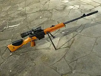 Тип патрона указывается на левой стороне ствольной коробки. Винтовка имеет тяжёлый ствол длиной 552 мм с дульным тормозом-пламегасителем.