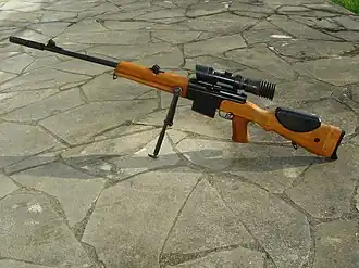 В задней части цевья в центре тяжести винтовки к цевью крепятся складные и регулируемые по высоте сошки, при переноске винтовки они складываются вперед и убираются в пазы по обеим сторонам ствольной накладки. Сошки используются всегда, за исключением случаев, когда огонь ведётся из-за укрытия (например, из-за невысокой стены). Длина подпружиненных ножек сошки регулируется при помощи установленных на них хомутов. Сошка складывается при полностью убранных ножках.