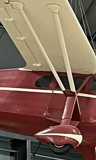 Двухлучевой V-обра́зный[ком 3] подкос исходил из нижней части фюзеляжа (под передней частью двери) и крепился концами к середине крыла — концы располагались друг за другом параллельно фюзеляжу, в передней и задней части крыла (прямо возле начинавшегося элерона — у его конца ближнего к фюзеляжу).