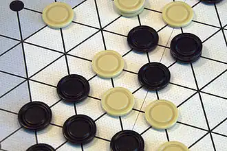 Соперники по очереди выставляют на край шестиугольного игрового поля фишки (один чёрные, другой белые), делая ход вглубь поля по направляющим линиям сетки до пересечения с другой линией, собирая ряд (линию) из четырёх подряд фишек своего цвета. Если поле по направлению хода занято своей или чужой фишкой, то она и весь примыкающий к ней ряд сдвигаются в направлении хода. Собравшиеся в ряд четыре фишки одного цвета (вне зависимости от того, чей ход привёл к такой ситуации) снимаются с поля их владельцем в запас вместе с примыкающими к ним в этом ряду своими и чужими фишками. В случае образования нескольких таких рядов разных цветов (четыре и более подряд белых и четыре и более подряд чёрных), первым снимает тот игрок, чей ход привёл к такой ситуации. При образовании нескольких пересекающихся рядов по четыре и более фишки одного цвета снимается один ряд на выбор владельца или оба ряда, если ряды не пересекаются. Захваченные фишки противника больше в игру не возвращаются. Цель игры — оставить противника без фишек в запасе. Ничьей не бывает. Проигрывает тот, кто первый остался без фишек.