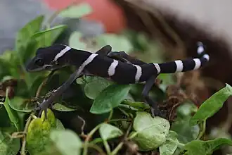 Фотография. Имеют тёмно-буро окраску с тремя светлыми полосами между поясами конечностей. Сначала был разведён в неволе и только потом научно описан. Населяет карстовые районы, обычно не выше 400 м над уровнем моря. Вероятно, подвержен угрозе исчезновения, так как его места обитания находятся в опасности[2].