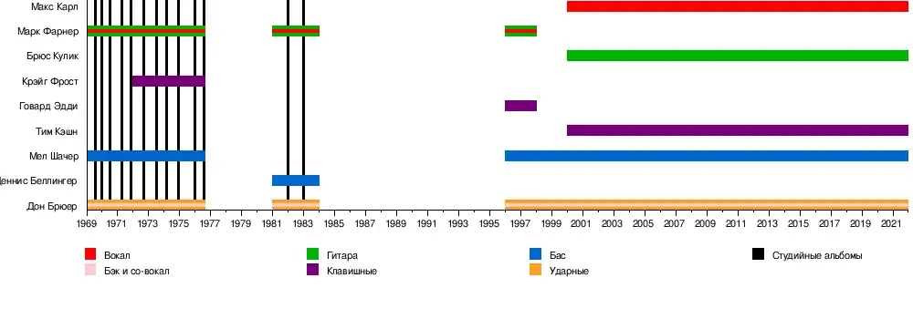 - Мел Шачер — бас-гитара (1969—1976, 1981, с 1996)
