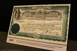 - 1923: Акции были впервые проданы, чтобы создать клуб как некоммеречскую организацию.[2] В общей сложности 5000 долларов было собрано за счет продажи 1000 акций по 5 долларов за штуку. Каждый акционер должен был купить шесть абонементов.[3] Чтобы гарантировать, что у акционеров никогда не будет каких-либо финансовых стимулов для перемещения клуба за пределы Грин-Бей, в первоначальных учредительных документах было предусмотрено, что в случае продажи франшизы вся прибыль от продажи будет передана в дар. на пост Салливана-Уоллена Американского легиона, предназначенный для строительства «настоящего солдатского мемориала». На годовом собрании в ноябре 1997 года акционеры проголосовали за смену бенефициара на Фонд Green Bay Packers Foundation, созданный для пожертвований благотворительным организациям и учреждениям по всему Висконсину.