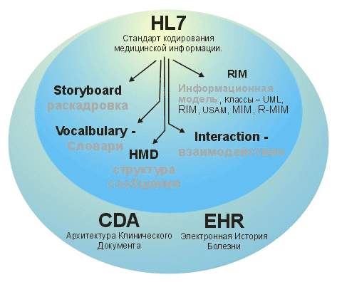 - содержательного словаря концептов HL7 с выходом на стандартные словари SNOMED, LOINC, DICOM;