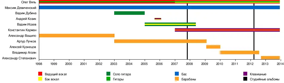 Олег Вяль начал мечтать играть музыку ещё в 1996 году[41]. На следующий год его брат приобрёл для своей группы ударную установку, и это стало первым материальным основанием для начала[41]. Олег хотел присоединится к коллективу брата, но его не взяли, так как тот ещё не играл ни на каком музыкальном инструменте[41]. В 1998 году будущий вокалист-гитарист собирает двух школьных товарищей, басиста Максима Девиченского и барабанщика Александра Ващило, в группу[41]. Все хотели играть музыку как воодушевлённые музыкальными группами общих друзей, такими как «Jitters», так и известными на весь мир группами, такими как «Nirvana», «Radiohead», «Pearl Jam»[35]. Первые годы ребята только учились, как играть, и экспериментировали с новыми идеями и методами написания произведений[35].