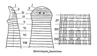 Тело сегментированное, сегменты I и XXVI—XXVII состоят из 1 кольца, сегменты II—III и XXV состоят из двух колец, сегменты IV—XXIV — из трёх колец. Суммарно количество колец равно 72.