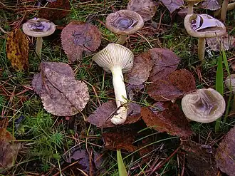 - Гигрофор оливково-белый (Hygrophorus olivaceoalbus) — съедобный гриб, обычно образующий микоризу с елью.