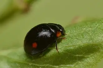 Жук длиной до 4,2 мм. Тело почти круглое, имеет чёрную окраску. На надкрыльях имеется одно красное пятно, расположенное ближе к середине[1].