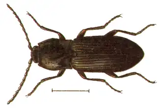 Жуки имеют чёрное уплощенное тело длиной 6-8,1 мм. Переднеспинка поперечная, покрыта мелкими точками. Ноги рыжевато-бурые[6].