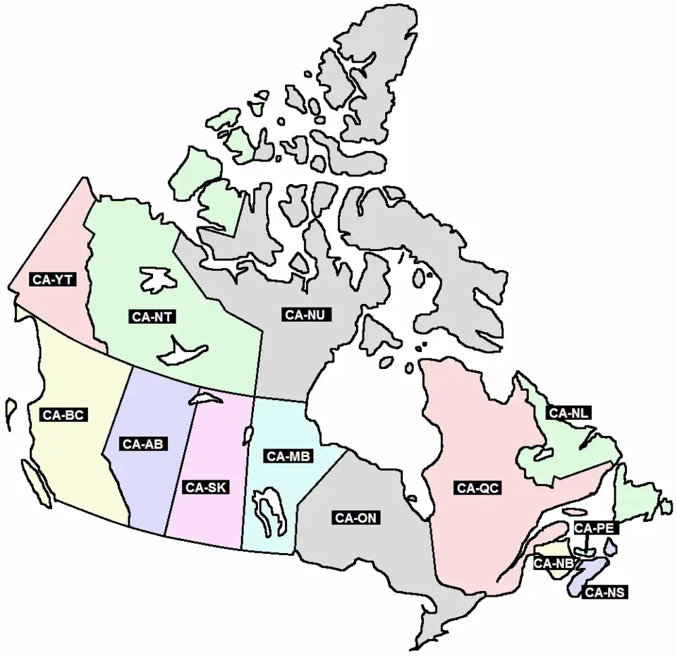 Геокоды 10 провинций и 3 территорий административно-территориального деления Канады.