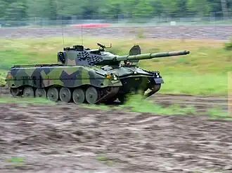 Также её могут относить к лёгким танкам или истребителям танков. Первый прототип был сделан в 1969 году; всего было произведено 212 экземпляров за время серийного производства в 1975—1978 годах. В 2002 году снята с вооружения, была заменена на Strf 90 и Strv 122, представляющий собой лицензионный немецкий танк Леопард 2А5, в конструкцию которого внесены различные изменения.