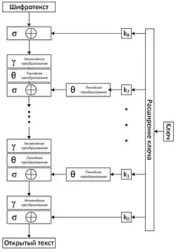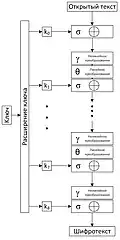 | Расписание (расширение) ключа | Аффинное преобразование, полученное в результате работы шифра в режиме обратной связи по шифрованному тексту | Схема Фейстеля, где функцией Фейстеля является раундовая функция шифра |