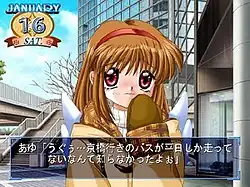 Аю Цукимия (яп. 月宮 あゆ Цукимия Аю) — низкорослая девушка, носящая на спине рюкзак с крыльями. Любит тайяки, которые часто ворует[28]. При обозначении себя использует местоимение боку (яп. 僕), характерное для речи юношей, а также постоянно употребляет в речи междометие «Угу» (яп. うぐぅ)[16]. После встречи они с Юити вспоминают, что были знакомы ранее, и главный герой соглашается помочь Аю в поисках потерянного ею неизвестного предмета[29]. Им оказалась фигурка ангела, подаренная Юити ей в детстве, на которой герой поклялся исполнить желания Аю[30]. Семь лет назад во время совместной игры последняя упала с дерева, а Юити, решив, что та погибла, от горя потерял память о тех событиях[30]. После рассказа Юити о своих воспоминаниях Аю исчезает, однако от своей тёти Акико он узнаёт, что всё это время девушка находилась в коме в местной больнице[31]. Придя в учреждение, Юити обнаруживает, что Аю только что сумела прийти в себя[30].