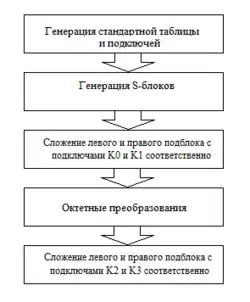 Алгоритм состоит из генерации подключей и стандартной таблицы замен. На основе стандартной таблицы замен строятся S-блоки для каждого октета преобразований.