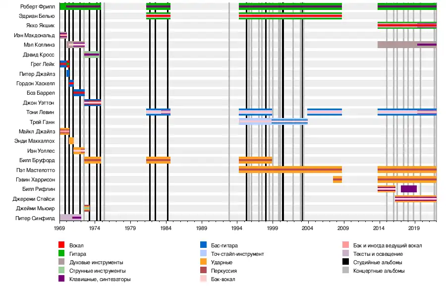 Роберт Фрипп Питер Синфилд Грег Лейк Майкл Джайлз Иэн Макдональд Мэл Коллинз Гордон Хаскелл Энди Маккаллох Боз Баррел Иэн Уоллес Билл Бруфорд Джон Уэттон Дэвид Кросс Джеми Мюир Эдриан Белью Тони Левин Пэт Мастелотто Трей Ганн Билл Рифлин Гэвин Харрисон Якко Якшик Джереми Стейси |