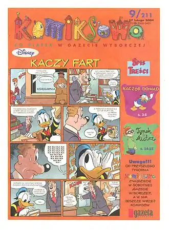 Постоянными элементами приложения были помещённые на первой странице короткие комиксы с названием «Утиный фарт!» (пол. Kaczy fart!) с Дональдом Даком в главной роли и Микки Маусом в комиксах «Отгадай с Микки» (пол. Zgaduj z Mikim).