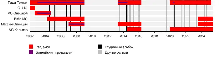 - Паша Техник (aka technique) (1984—2025) — речитатив, инструменталы, тексты (2002—2009, 2013—2016, 2020—2025)