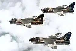 A-7 Corsair IIамериканский штурмовик, разработанный компанией Линг-Темко-Воут в середине 1960-х годов на базе истребителя F-8 «Крусейдер». Состоял на вооружении ВМС и ВВС США, активно применялся во Вьетнамской войне, а также ещё в нескольких вооружённых конфликтах, включая Войну в Персидском Заливе[2]. В США снят с вооружения в 1993 году, однако несколько стран продолжали эксплуатировать A-7 и позднее.