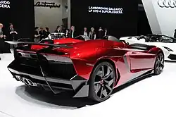 Прообраз будущего Lamborghini Aventador Roadster, созданный в единственном экземпляре. Технически автомобиль повторяет базовое купе: он оснащён 700-сильным мотором V12, роботизированной КПП и полным приводом, но отличается от него дизайном, габаритами и массой — спайдер длиннее (4890 против 4780 мм) и легче[2]. Максимальная скорость составляет 350 км/ч, а чтобы разогнаться до 100 км/ч Aventador J требуется 3,2 секунды. Карбоновый монокок новинки подвергся переработке. На классическом Aventador он состоит из кабины и крыши, соединённых болтами и склеенных, а на спайдере крыша заменена парой массивных карбоновых дуг за сиденьями. Ветровое стекло в Aventador J лишь «обозначено» парой стеклянных карманов перед водительским и пассажирским сиденьями. Кроме того, в автомобиле нет кондиционера и аудиосистемы.