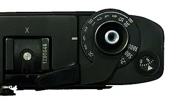 На верхней панели размещена головка ввода светочувствительности фотоплёнки. Значения светочувствительности 6-3200 ISO.