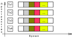 - Способом разнесения посредством пространственно-временного кодирования (логическое развитие первого способа).[2]