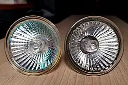 Отражающее покрытие рефлектора может быть как алюминиевым непрозрачным, так и полупрозрачным интерференционным. Алюминиевое покрытие отражает всё излучение лампы, в том числе и инфракрасное, что может быть нежелательно при освещении чувствительных к нагреву объектов. Интерференционное покрытие представляет собой тонкое полупрозрачное напыление, толщина которого подобрана таким образом, чтобы оно отражало во фронтальном направлении преимущественно видимое излучение, а инфракрасное — пропускало. Лампы с интерференционным отражателем меньше нагревают объект освещения, но больше нагревают светильник, в котором они установлены. Комбинация галогенного источника света и интерференционного покрытия позволяет таким лампам обладать лучшим индексом цветопередачи и более высокой цветовой температурой, чем стандартные лампы накаливания. Эти качества делают их более подходящими для применения в устройствах, в которых более важна цветопередача, например для освещения торговых витрин. Лампы с интерференционным рефлектором иногда некорректно называют «дихроичными» (от английского названия dichroic lamps).[1]