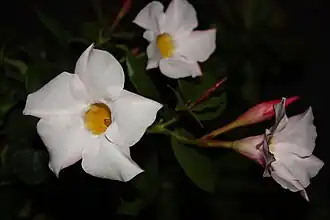Другие сорта: Mandevilla 'Red Riding Hood' с бледно-красными цветками, 'My Fair Lady' с белыми цветками, жёлтой трубкой и розовыми бутонами, 'Alba' с белыми цветками, 'Rosea' с бледно-розовыми цветками и жёлтой трубкой[2].