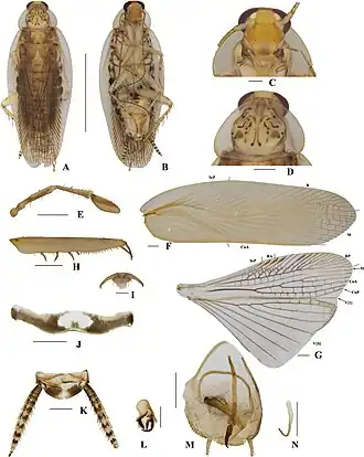 Тело небольшое (около 1 см), желтовато-коричневое. От близких видов может быть отличим по следующим признакам: левый фалломер с тремя шипами; вершина срединного фалломера с изогнутым длинным шипом; акцессорный склерит медианного фалломера с поперечным стержнем, но без щёточной структуры у вершины; левый фалломер с палочковидной структурой; передневентральный край переднего бедра Тип B2. Межоцеллярное расстояние немного шире расстояния между глазами, уже расстояния между усиковыми впадинами. Пятый нижнечелюстной пальмомер расширен, третий и четвёртый пальмомер оба длиннее пятого. Переднеспинка субэллиптическая, шире длины, диск обычно с симметричными макулами и полосами. Надкрылья и задние крылья полностью развиты. Вид был впервые описан в 2021 году. Валидный статус вида был подтверждён в 2024 году китайскими энтомологами из Southwest University (Чунцин, Китай)[1][3].