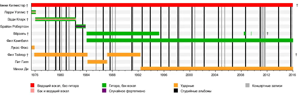 Иэн Фрейзер «Лемми» Килмистер Фил Кэмпбелл Микки Ди Ларри Уоллис Эдди «Фаст» Кларк Брайан "Роббо" Робертсон Мик «Вёрзель» Бёрстон Лукас Фокс Фил «Грязное Животное» Тэйлор Пит Гилл |
