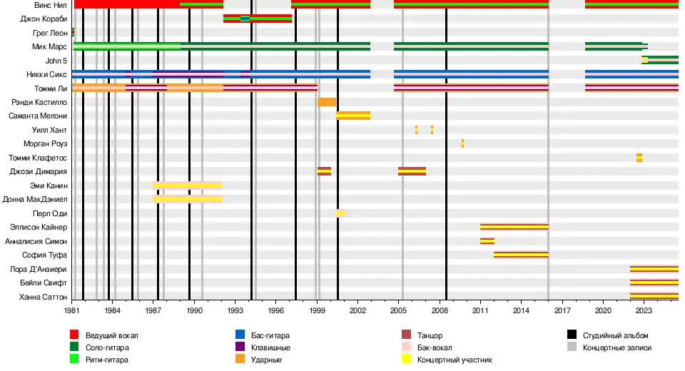 - Никки Сикс — бас-гитара, бэк-вокал, клавишные (1981—2015, 2018—настоящее время), клавишные (1988—1993)