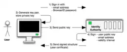 В момент, когда пользователь идентифицируется на проверяющей стороне при помощи выбранного почтового адреса, браузер в фоновом режиме проверяет у себя наличие сертификата для этого адреса. В том случае, если у браузера нет подходящего сертификата, он запрашивает новый сертификат у «поставщика идентификации».