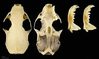 Череп мелкий, довольно слабый, вытянутый и относительно широкий[15]. Скуловые дуги слабые и тонкие[19]. Бакулюм длиной ≈25 мм, тонкий, спереди загнут кверху под тупым углом. У молодых самцов бакулюм меньше, равно как и изгиб[20]. Когти светлые и острые[16].