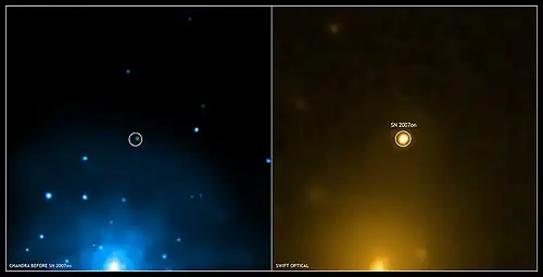 Источник рентгеновского излучения до вспышки сверхновой на снимке телескопа Chandra (слева) и сверхновая SN 2007on (справа).