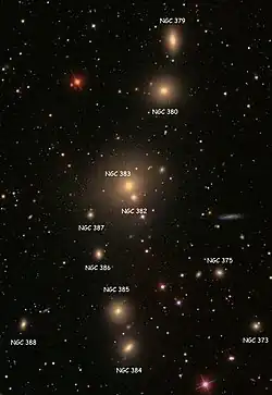 Есть ещё четыре близлежащие галактики NGC 379, NGC 380, NGC 385 и NGC 384, которые предположительно тесно связаны с NGC 383, а также несколько других галактик на относительно близком расстоянии.