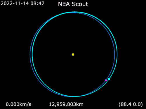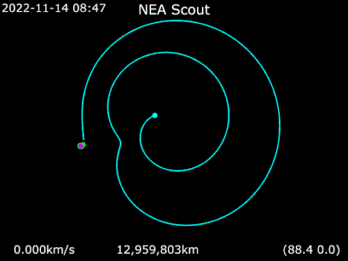 На 17 ноября 2022 года отсутствовала информация о двух из десяти кубсатов, запущенных в миссии «Артемида-1» в качестве попутной нагрузки, в том числе об аппарате NEA Scout[10]. По состоянию на 18 ноября 2022 года (через два дня после запуска) связь с аппаратом установить не удалось[11]. Попытки передать на борт аппарата команды на развёртывание солнечного паруса закончились неудачей, по состоянию на декабрь 2022 года NEA Scout считается потерянным[12].