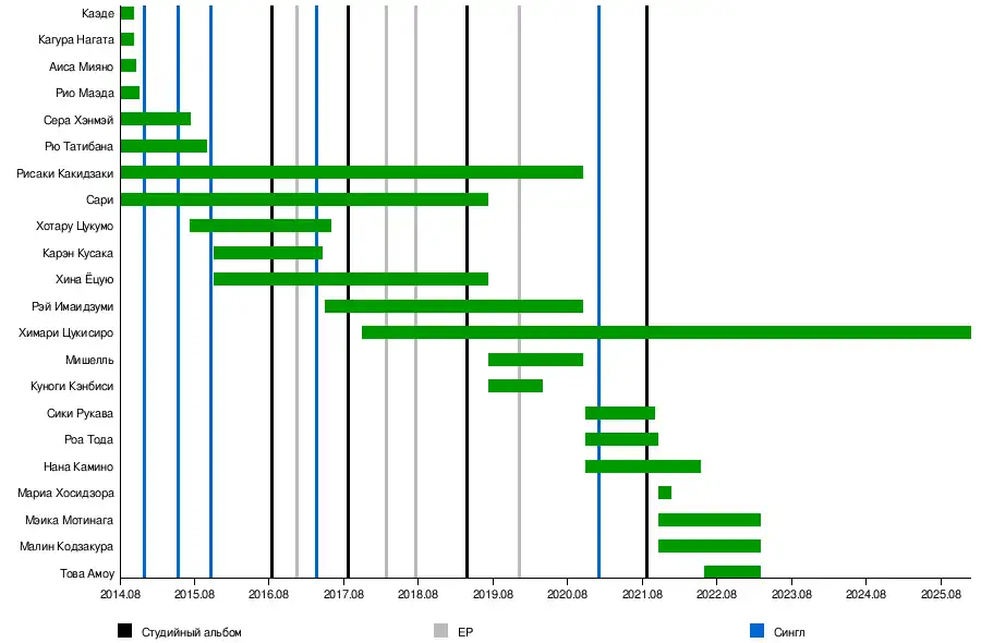 - Сари (2014—2019, покинула проект, чтобы сфокусироваться на сольной карьере Архивная копия от 24 февраля 2022 на Wayback Machine)