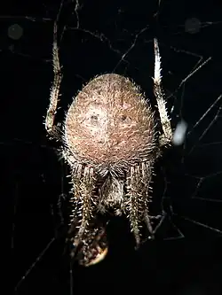 ![]() Neoscona crucifera на паутине, вид снизу | ||||||||||