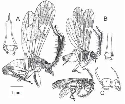 Три вида рода Novopsocus. A. N. magnus, B. N. stenopterus, C. N. caeciliae.