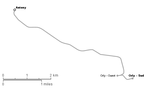 Протяжённость линии Orlyval составляет 7,3 км, линия состоит всего из трёх станций: Antony (линия