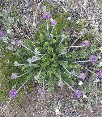 Растение бесстебельное, дернистое, с густым опушением. Цветоносы равны листьям или длиннее. Прилистники перепончатые, широкояйцевидные, тонко заострённые, высоко сросшиеся между собой и у основания с черешком, с сетчатыми жилками, снаружи волосистые. Листочки продолговатые или продолговато-ланцетные, в 8—12 мутовках, с обеих сторон опушённые.